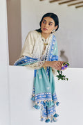 A contrasting chiffon duppata in ice blue, with a double tone design. It features embroidered borders on all four sides and an all-over spray effect. Lace details in white enhance its appearance, and it is finished with tassels.