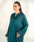 The iconic zinc-colored outfit with glasswork detailing on the neckline and shirt presents a stunning blend of modernity and craftsmanship. The shirt is made from a smooth, lightweight tulle fabric with a soft sheen that subtly enhances its sophisticated zinc hue. Intricate glasswork embellishes the neckline, featuring delicate beads arranged in a mesmerizing pattern, catching the light and adding a touch of luxury to the piece. This refined glass detailing contrasts beautifully against the muted, industrial tone of zinc, making it a statement piece for both formal and semi-formal occasions. The shirt paired with tailored trouser to maintain an elegant look
